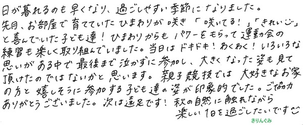 ご来場者の皆様、運動会に来ていただき心からありがとうございました。また来年も可愛いお子様の運動会の姿を見に来ていただけると嬉しいです。